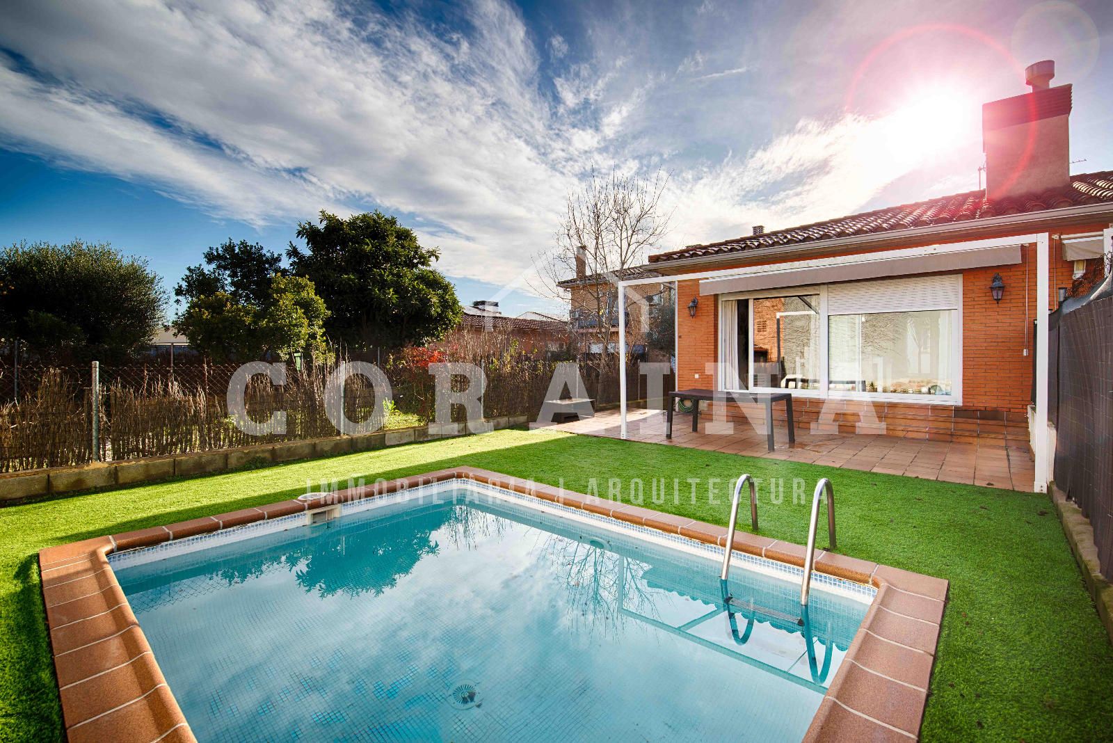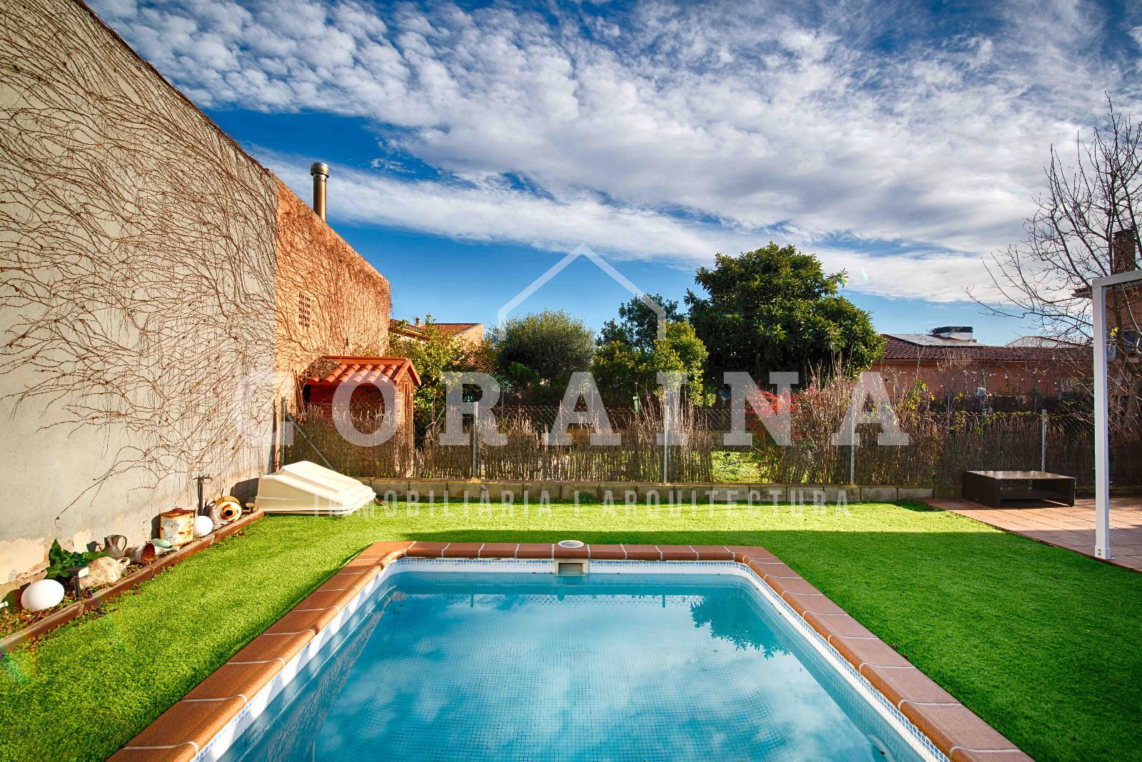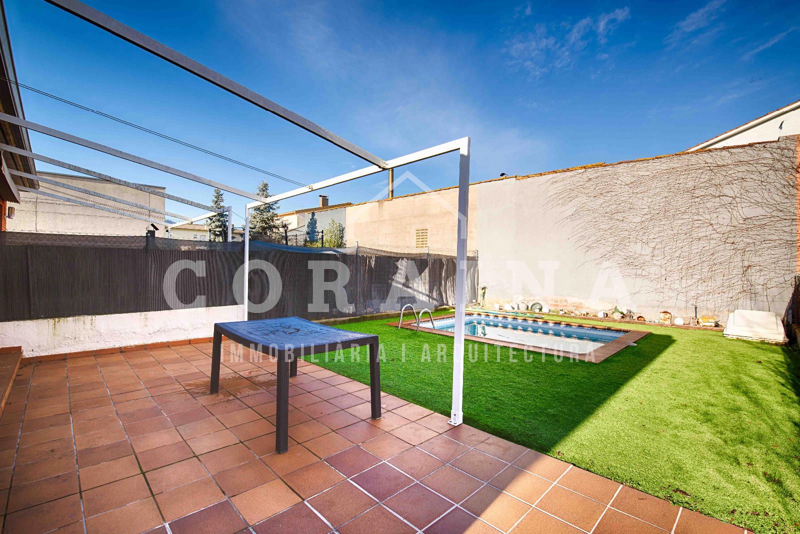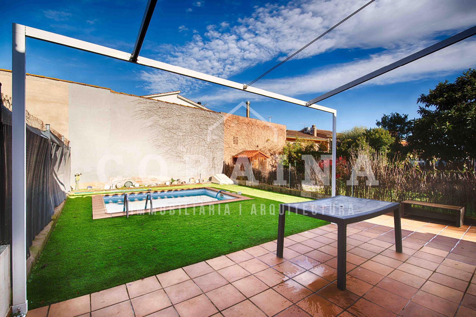 En el exterior, la casa cuenta con un agradable jardín dividido en dos zonas: una terraza ideal para comidas al aire libre y una zona de césped artificial, de fácil mantenimiento, donde encontramos una pequeña piscina de obra, perfecta para refrescarse y disfrutar en los meses de verano.