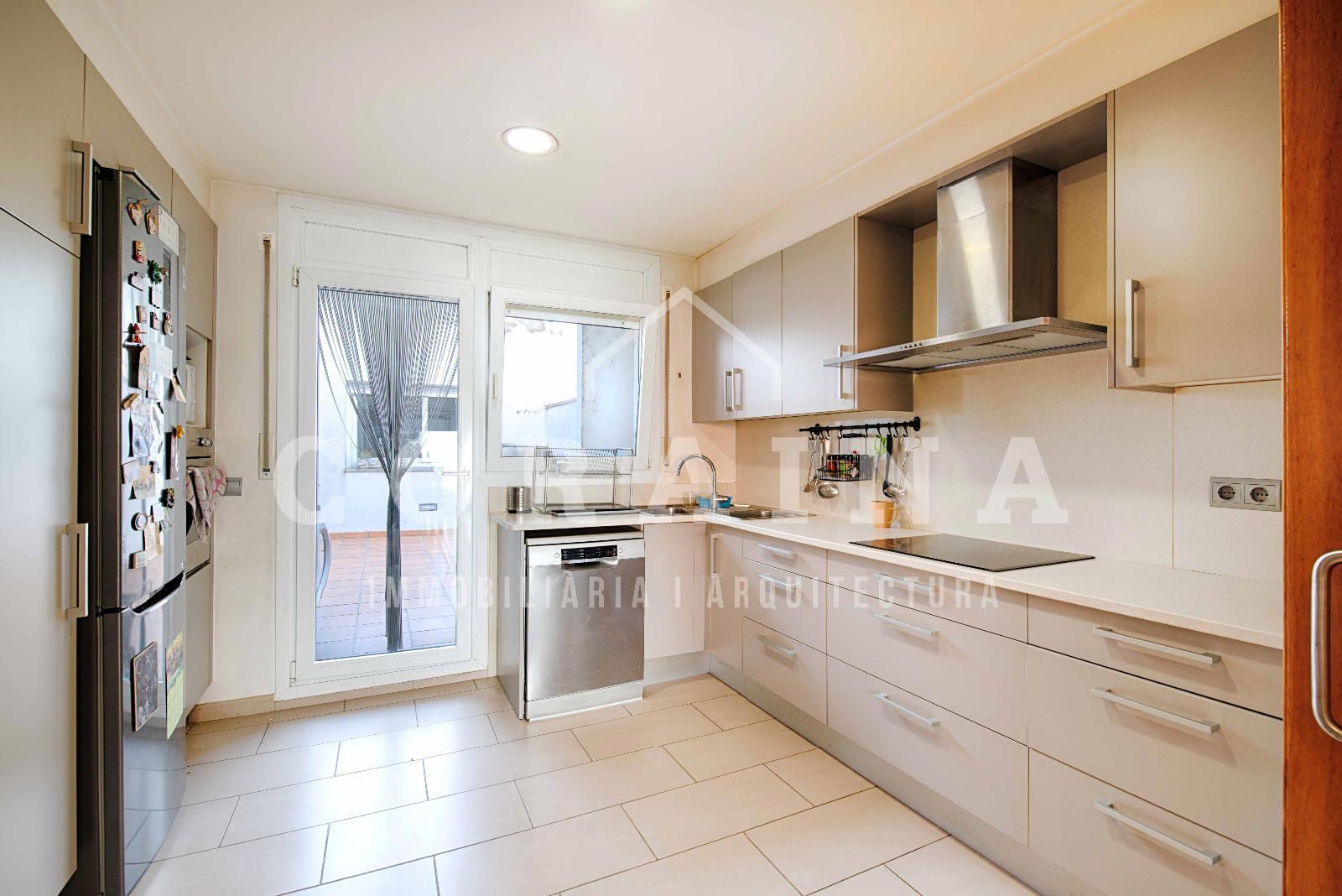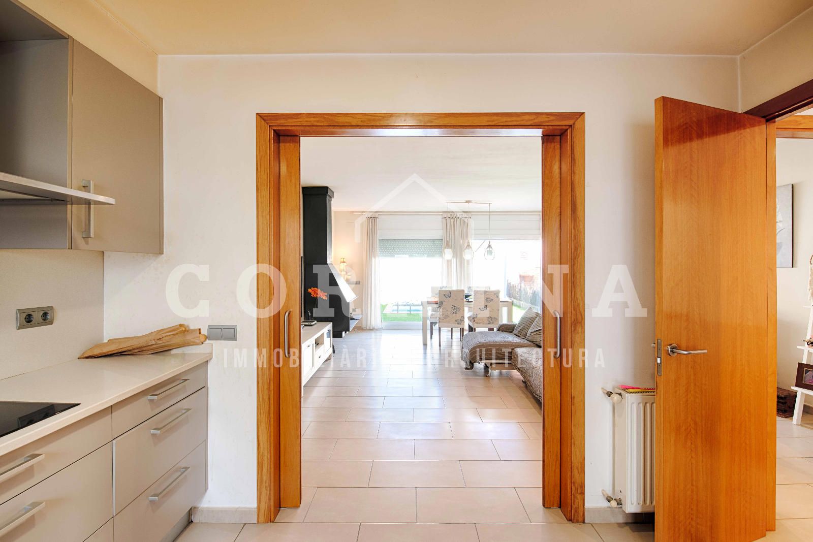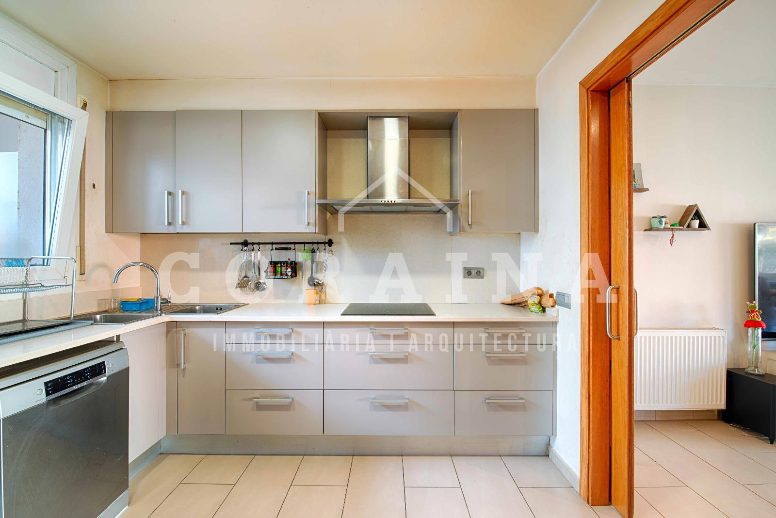 La cocina, práctica y bien aprovechada, se comunica con el salón mediante puertas correderas, permitiendo unir o separar ambos espacios según las necesidades del momento.